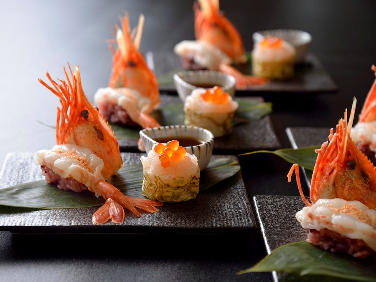 ディナー人気No.1のサーロインローストビーフや、椿油入りの油で揚げる天麩羅のほか、お一人様一皿のチケット制メニューとして「牡丹海老の握りと白海老磯海苔巻き」など、贅沢な逸品が並びます。